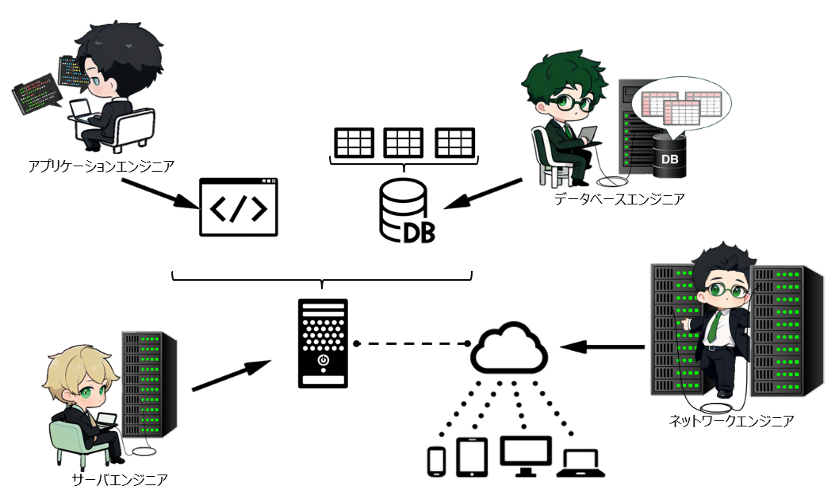 例えば、データベースチーム、ネットワークチーム、サーバ構築チームなどです。