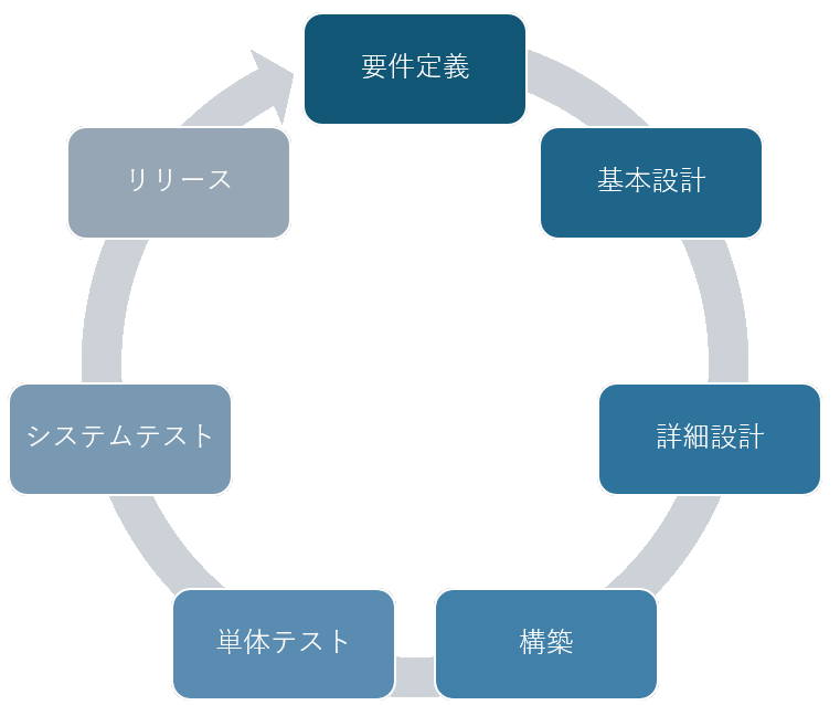 一般的なウォーターフォール開発の段階は以下のようになっています。